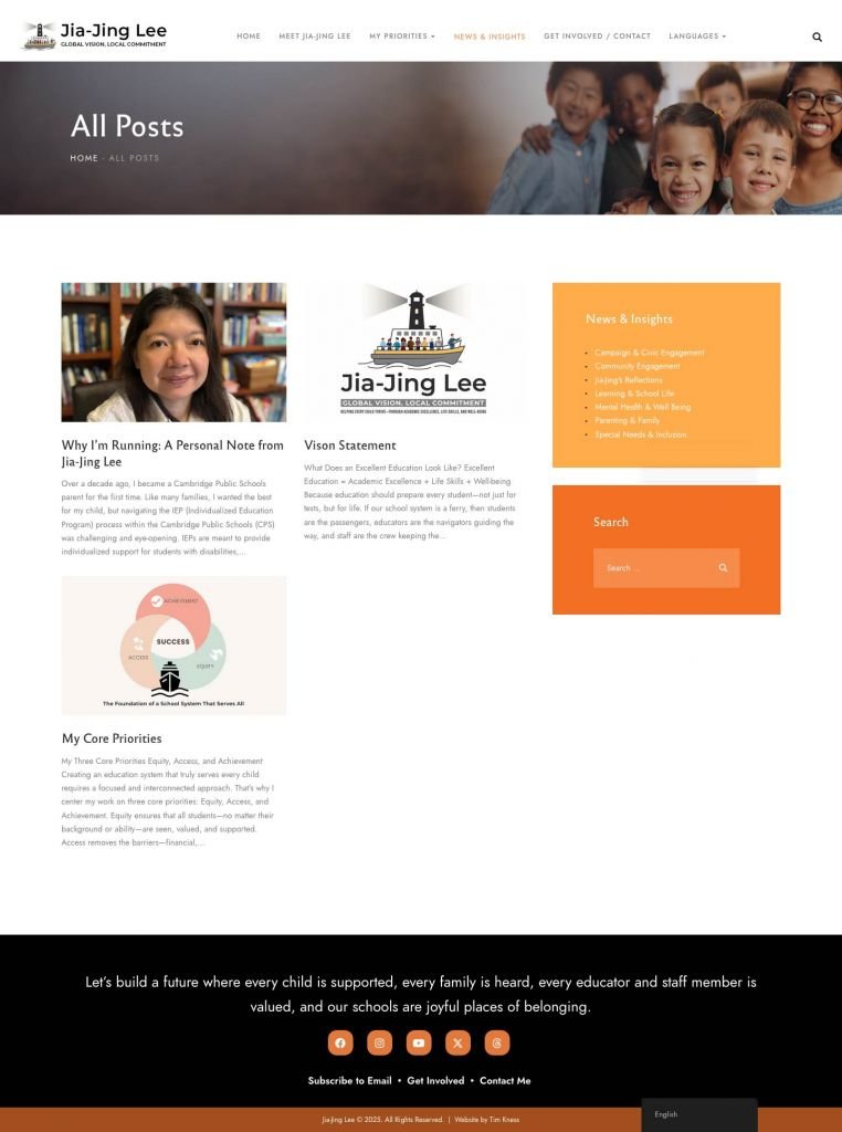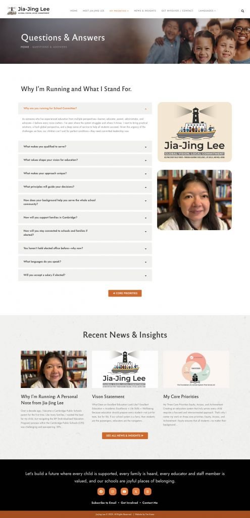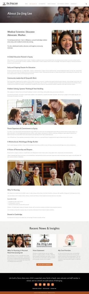 With the onset of an upcoming election for the School Committee in Cambridge, Massachusetts, my client, who was contemplating her run, needed a website to communicate her platform, her beliefs, and a forum to help educate and share with others like her who were struggling to make change to an education system from the “outside”.