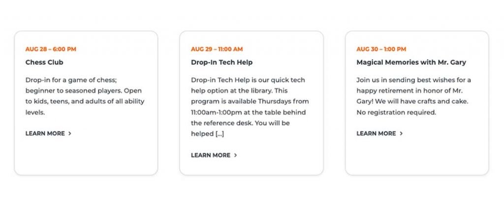 Scrolling down from the upper hero and quick-links area, the page displays an Events Row utilizing a dynamic, card-based design. This row is flexible, allowing library staff to display selected or rotational items to showcase their most recent events and aid visitors in quickly finding items of interest.